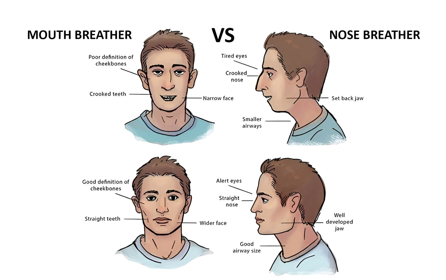 Mouth breathing, especially during formative years, can affect facial development. Research shows that it can lead to changes in jaw alignment and facial shape, often resulting in an elongated or narrower face, with potential jaw and posture implications that can persist into adulthood.